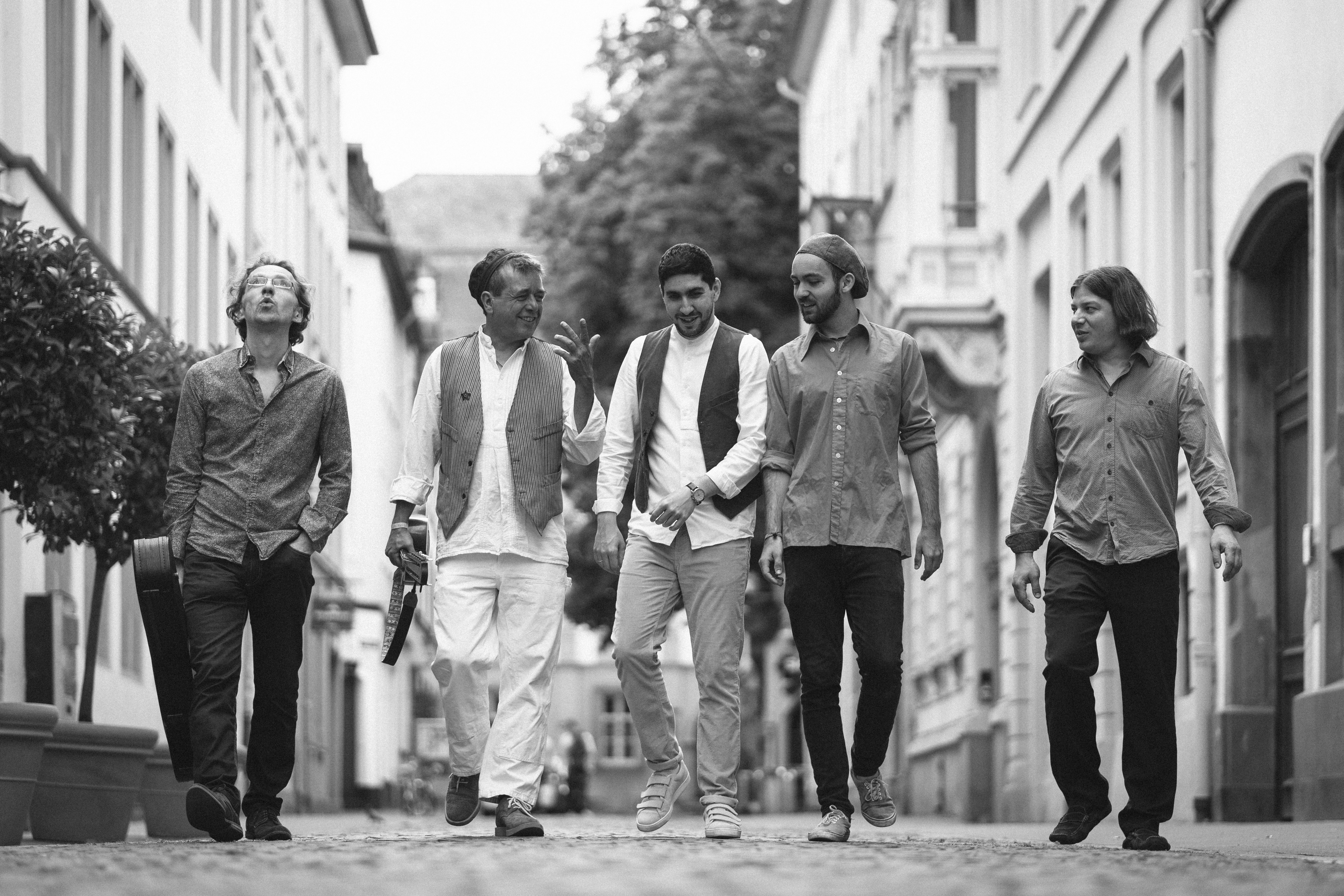 Die fünf Absintos gehören weit über ihre Rhein-Main-Heimat hinaus zu den Top- Liveacts der Folk- und Weltmusik-Szene. Auf ihren Konzerten reisen sie musikalisch in die Balkan-Metropolen, drehen eine Runde durch den Mittelmeerraum, biegen kurz vor dem Ural ab – und mischen dabei Eigenes mit Geborgtem. Während Kontrabass, Gitarre und Mandoline ein furioses Rhythmus-Feuerwerk zünden, fahren Saxophon und Geige auf der melodischen Achterbahn. Dazu zelebriert kerniger Gesang Lieder vom Sinti-Traditional bis Tom Waits – und alles dreht sich um Liebe und Vergänglichkeit, Witz und Sehnsucht, Melancholie und Rausch.